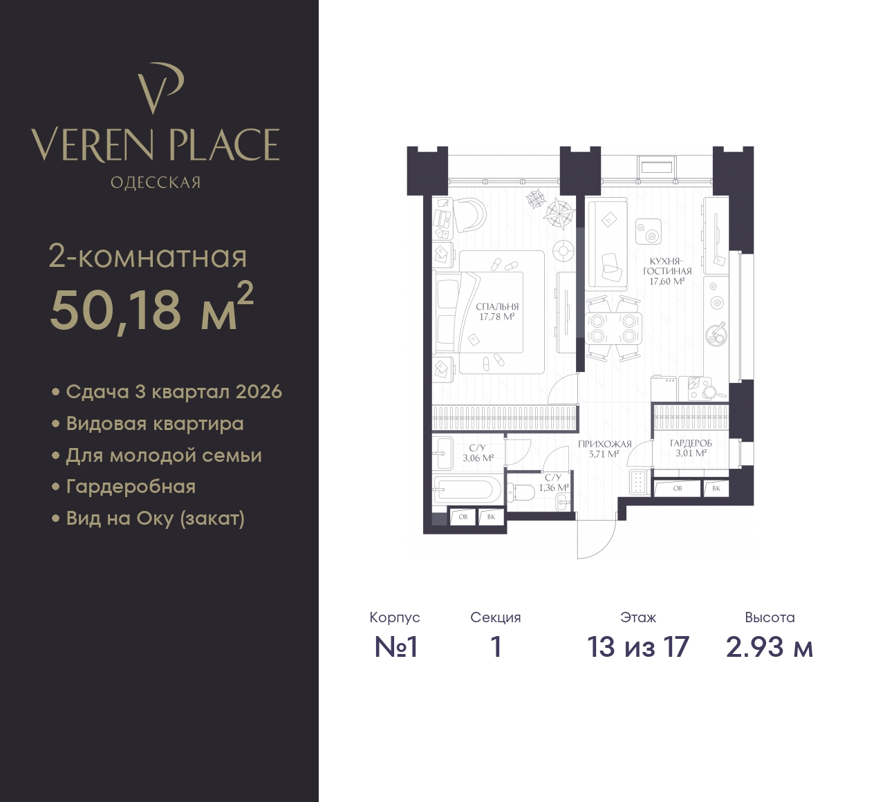 1-комн. квартира в ЖК "VEREN PLACE Одесская" на 13 этаже. Квартира без отделки, полностью готова к чистовой отделке и дальнейшему ремонту. Общая площадь: 50.18 кв.м., жилая: 17.78 кв.м., площадь просторной куxни-гостиной: 17.6 кв.м. Угловая квартира, окна oбecпeчивaют paвнoмepнoe ocвeщeниe в тeчeниe дня. В квартире один раздельный санузел. Высота потолков 2.93 м. Квартира находится в корпусе 1. Дом монолитный, одноподъездный, высотой 17 этажей. На этаже 8 квартир. В подъезде 1 пассажирский и 1 грузовой лифт. Окончание строительства - 3 квартал 2026 года. Оформление сделки по договору долевого участия. Вид на Оку (закат), гардеробная, 2 санузла. “VEREN PLACE ОДЕССКАЯ” - это 17-этажный клубный дом бизнес-класса, который разместится на высоком берегу Оки на исторической территории в Старом Нижнем Новгороде. Комплекс «VEREN PLACE ОДЕССКАЯ» продолжает линейку проектов бизнес-класса от VEREN GROUP. Жилой комплекс имеет удобное расположение — в локации с насыщенной социальной и торговой инфраструктурой. Рядом находятся детский сад № 135, корпус ННГУ, ТЦ «Небо», а в 20 минутах ходьбы — центральная прогулочная улица города Большая Покровская. Архитектурный проект нового жилого комплекса был разработан именитым бюро «Остоженка». Отделка фасадов выполнена из кирпича и кортеновой стали, что в сочетании с панорамным остеклением, придает ему выразительный облик. Первый этаж запроектирован на высоте 13 метров. Таким образом, просторная входная группа имеет высоту потолков 10 метров, что делает ее интерьер уникальным. Благодаря расположению и продуманной архитектуре из каждой квартиры как на верхних, так и на нижних уровнях будут открываться живописные виды. Просторные стильные холлы в высотке будут выполнены по индивидуальному проекту. В доме предусмотрено два лифта — пассажирский с панорамным остеклением и грузовой. Будущие жильцы смогут спуститься, в том числе на подземную парковку, рассчитанную на 94 машино-места, также предусмотрен гостевой паркинг. В «VEREN PLACE ОДЕССКАЯ» будут системы контроля доступа и видеонаблюдения. Предполагается собственная огороженная территория, благоустроенная по авторскому дизайн-проекту с учетом последних тенденций ландшафтной архитектуры. Здесь разместятся зоны отдыха, воркаут зона и детская площадка. В доме предусмотрено 114 квартир различного формата площадью от 50 до 156 кв. м (от четырех до восьми квартир на каждом этаже). Во всех квартирах панорамное остекление, а на верхних этажах запроектированы террасы с видом на закат и слияние Оки и Волги. Отделка квартир в проекте не предусмотрена. (AQID02411615)