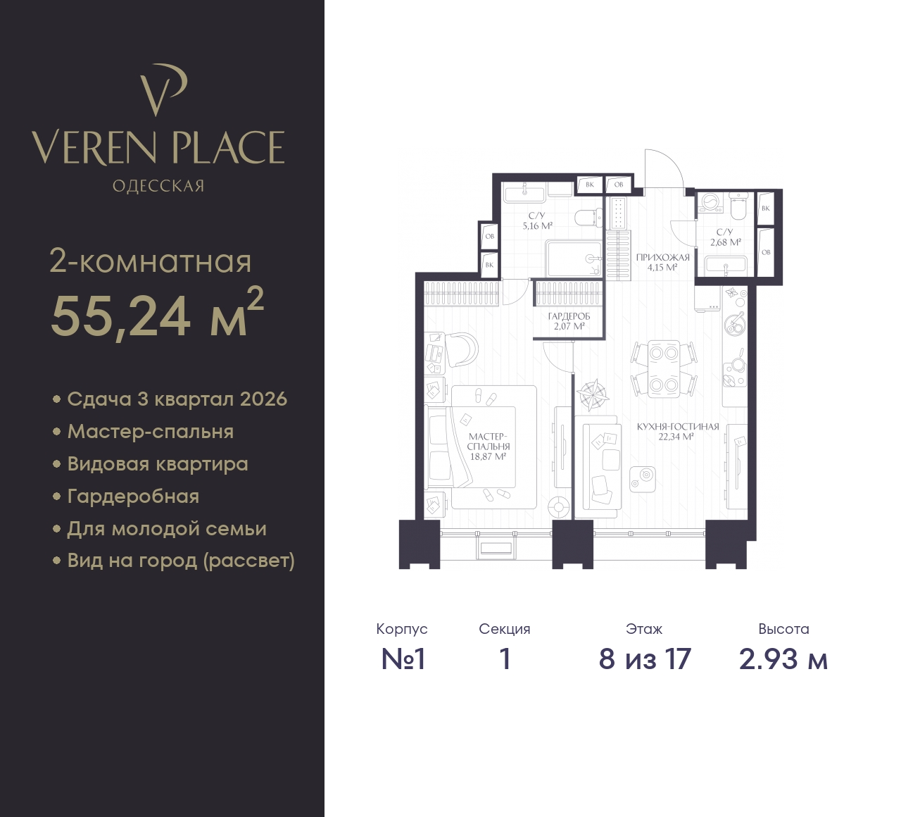 1-комн. квартира в ЖК "VEREN PLACE Одесская" на 8 этаже. Квартира без отделки, полностью готова к ремонту. Общая площадь: 55.24 кв.м., жилая: 18.87 кв.м., площадь просторной куxни-гостиной: 22.34 кв.м. Все окна выходят на одну сторону. В квартире один совмещенный и один раздельный санузел. Высота потолков 2.93 м. Квартира находится в корпусе 1. Дом монолитный, одноподъездный, высотой 17 этажей. На этаже 8 квартир. В подъезде 1 пассажирский и 1 грузовой лифт. Окончание строительства - 3 квартал 2026 года. Оформление сделки по договору долевого участия. Вид на город (рассвет), мастер-спальня, гардеробная, 2 санузла. “VEREN PLACE ОДЕССКАЯ” - это 17-этажный клубный дом бизнес-класса, который разместится на высоком берегу Оки на исторической территории в Старом Нижнем Новгороде. Комплекс «VEREN PLACE ОДЕССКАЯ» продолжает линейку проектов бизнес-класса от VEREN GROUP. Жилой комплекс имеет удобное расположение — в локации с насыщенной социальной и торговой инфраструктурой. Рядом находятся детский сад № 135, корпус ННГУ, ТЦ «Небо», а в 20 минутах ходьбы — центральная прогулочная улица города Большая Покровская. Архитектурный проект нового жилого комплекса был разработан именитым бюро «Остоженка». Отделка фасадов выполнена из кирпича и кортеновой стали, что в сочетании с панорамным остеклением, придает ему выразительный облик. Первый этаж запроектирован на высоте 13 метров. Таким образом, просторная входная группа имеет высоту потолков 10 метров, что делает ее интерьер уникальным. Благодаря расположению и продуманной архитектуре из каждой квартиры как на верхних, так и на нижних уровнях будут открываться живописные виды. Просторные стильные холлы в высотке будут выполнены по индивидуальному проекту. В доме предусмотрено два лифта — пассажирский с панорамным остеклением и грузовой. Будущие жильцы смогут спуститься, в том числе на подземную парковку, рассчитанную на 94 машино-места, также предусмотрен гостевой паркинг. В «VEREN PLACE ОДЕССКАЯ» будут системы контроля доступа и видеонаблюдения. Предполагается собственная огороженная территория, благоустроенная по авторскому дизайн-проекту с учетом последних тенденций ландшафтной архитектуры. Здесь разместятся зоны отдыха, воркаут зона и детская площадка. В доме предусмотрено 114 квартир различного формата площадью от 50 до 156 кв. м (от четырех до восьми квартир на каждом этаже). Во всех квартирах панорамное остекление, а на верхних этажах запроектированы террасы с видом на закат и слияние Оки и Волги. Отделка квартир в проекте не предусмотрена. (AQID02411651)