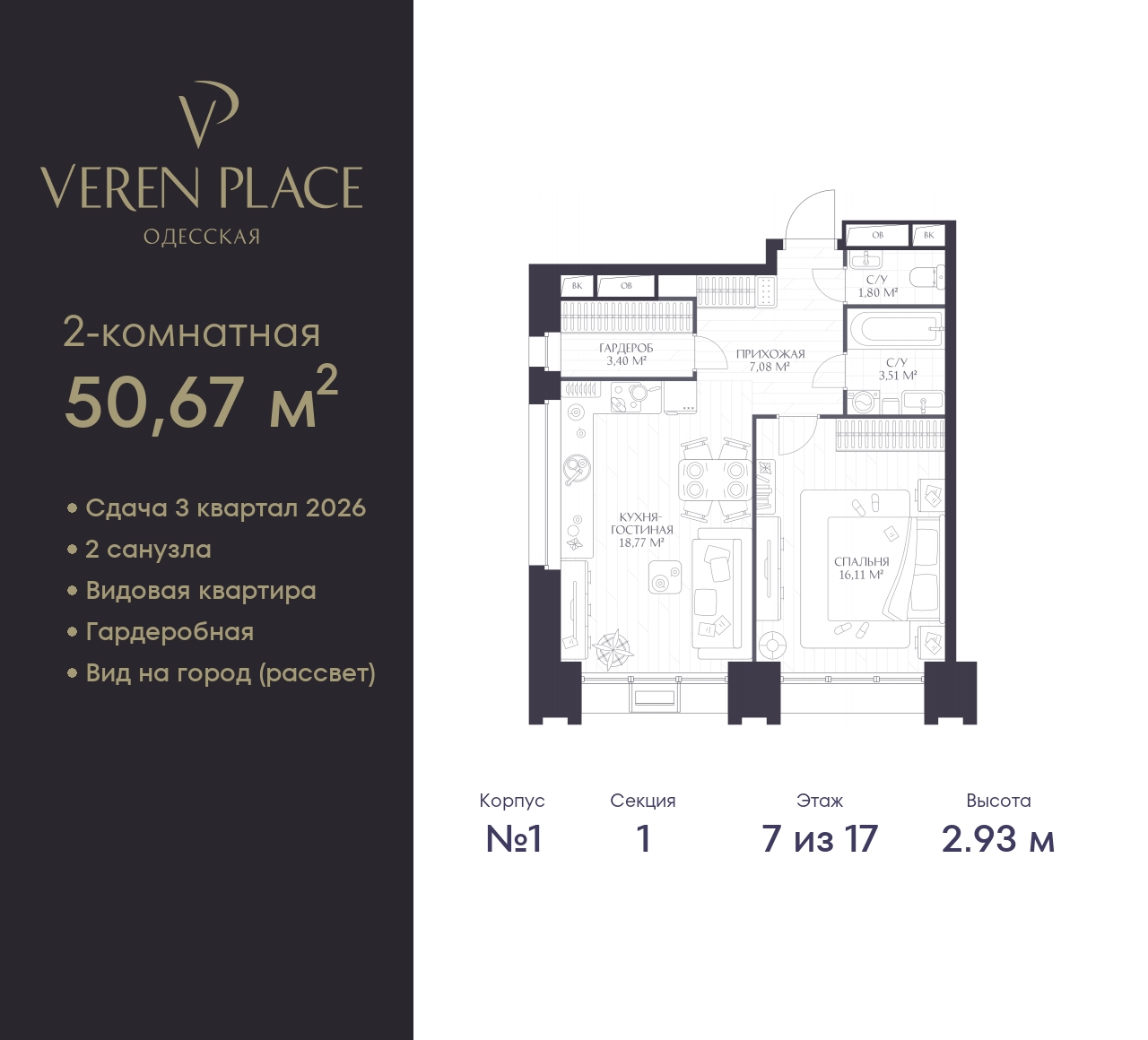 Продается 1-комн. квартира в ЖК "VEREN PLACE Одесская" на 7 этаже. Квартира без отделки, новый собственник может сделать ремонт по своему дизайн-проекту. Общая площадь: 50.67 кв.м., жилая: 16.11 кв.м., площадь просторной куxни-гостиной: 18.77 кв.м. Угловая квартира, очень светлая, естественная вентиляция при открытии окон. В квартире один раздельный санузел. Высота потолков 2.93 м. Квартира находится в корпусе 1. Дом монолитный, одноподъездный, высотой 17 этажей. На этаже 8 квартир. В подъезде 1 пассажирский и 1 грузовой лифт. Окончание строительства - 3 квартал 2026 года. Оформление сделки по договору долевого участия. Вид на город (рассвет), гардеробная, 2 санузла. “VEREN PLACE ОДЕССКАЯ” - это 17-этажный клубный дом бизнес-класса, который разместится на высоком берегу Оки на исторической территории в Старом Нижнем Новгороде. Комплекс «VEREN PLACE ОДЕССКАЯ» продолжает линейку проектов бизнес-класса от VEREN GROUP. Жилой комплекс имеет удобное расположение — в локации с насыщенной социальной и торговой инфраструктурой. Рядом находятся детский сад № 135, корпус ННГУ, ТЦ «Небо», а в 20 минутах ходьбы — центральная прогулочная улица города Большая Покровская. Архитектурный проект нового жилого комплекса был разработан именитым бюро «Остоженка». Отделка фасадов выполнена из кирпича и кортеновой стали, что в сочетании с панорамным остеклением, придает ему выразительный облик. Первый этаж запроектирован на высоте 13 метров. Таким образом, просторная входная группа имеет высоту потолков 10 метров, что делает ее интерьер уникальным. Благодаря расположению и продуманной архитектуре из каждой квартиры как на верхних, так и на нижних уровнях будут открываться живописные виды. Просторные стильные холлы в высотке будут выполнены по индивидуальному проекту. В доме предусмотрено два лифта — пассажирский с панорамным остеклением и грузовой. Будущие жильцы смогут спуститься, в том числе на подземную парковку, рассчитанную на 94 машино-места, также предусмотрен гостевой паркинг. В «VEREN PLACE ОДЕССКАЯ» будут системы контроля доступа и видеонаблюдения. Предполагается собственная огороженная территория, благоустроенная по авторскому дизайн-проекту с учетом последних тенденций ландшафтной архитектуры. Здесь разместятся зоны отдыха, воркаут зона и детская площадка. В доме предусмотрено 114 квартир различного формата площадью от 50 до 156 кв. м (от четырех до восьми квартир на каждом этаже). Во всех квартирах панорамное остекление, а на верхних этажах запроектированы террасы с видом на закат и слияние Оки и Волги. Отделка квартир в проекте не предусмотрена. (AQID02415828)