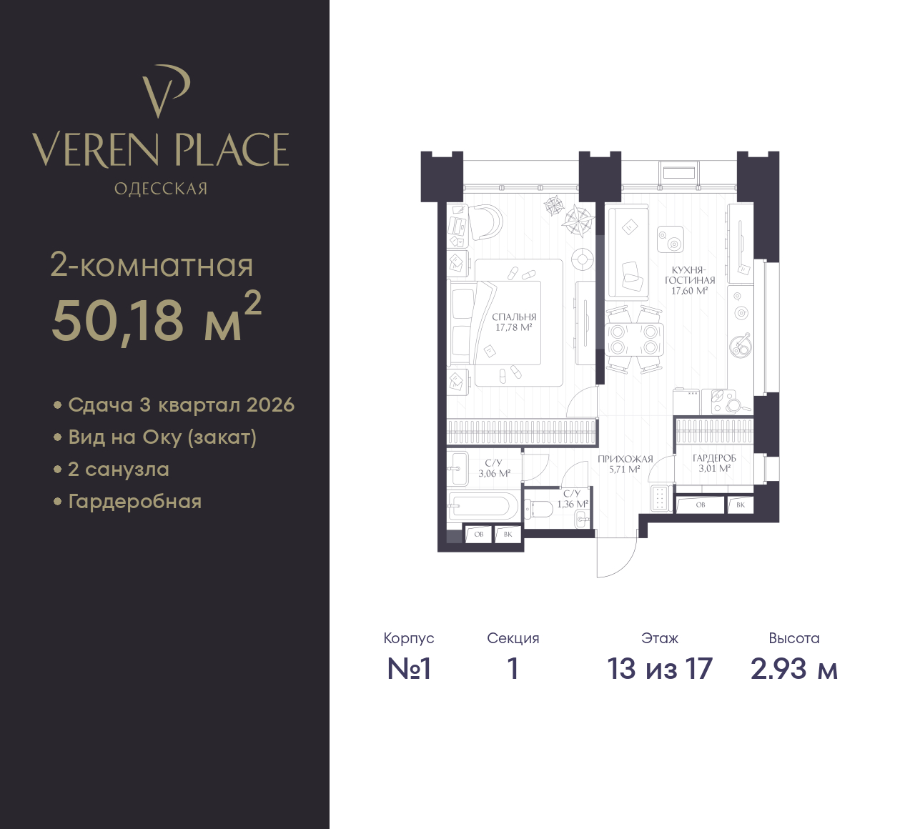 Продается 1-комн. квартира в ЖК "VEREN PLACE Одесская" на 13 этаже. Квартира без отделки, после оформления собственности можно делать ремонт. Общая площадь: 50.18 кв.м., жилая: 17.78 кв.м., площадь просторной куxни-гостиной: 17.6 кв.м. Квартира угловая, окна oбecпeчивaют paвнoмepнoe ocвeщeниe в тeчeниe дня. В квартире один раздельный санузел. Высота потолков 2.93 м. Квартира находится в корпусе 1. Дом монолитный, одноподъездный, высотой 17 этажей. На этаже 8 квартир. В подъезде 1 пассажирский и 1 грузовой лифт. Окончание строительства - 3 квартал 2026 года. Оформление сделки по договору долевого участия. Вид на Оку (закат), гардеробная, 2 санузла. “VEREN PLACE ОДЕССКАЯ” - это 17-этажный клубный дом бизнес-класса, который разместится на высоком берегу Оки на исторической территории в Старом Нижнем Новгороде. Комплекс «VEREN PLACE ОДЕССКАЯ» продолжает линейку проектов бизнес-класса от VEREN GROUP. Жилой комплекс имеет удобное расположение — в локации с насыщенной социальной и торговой инфраструктурой. Рядом находятся детский сад № 135, корпус ННГУ, ТЦ «Небо», а в 20 минутах ходьбы — центральная прогулочная улица города Большая Покровская. Архитектурный проект нового жилого комплекса был разработан именитым бюро «Остоженка». Отделка фасадов выполнена из кирпича и кортеновой стали, что в сочетании с панорамным остеклением, придает ему выразительный облик. Первый этаж запроектирован на высоте 13 метров. Таким образом, просторная входная группа имеет высоту потолков 10 метров, что делает ее интерьер уникальным. Благодаря расположению и продуманной архитектуре из каждой квартиры как на верхних, так и на нижних уровнях будут открываться живописные виды. Просторные стильные холлы в высотке будут выполнены по индивидуальному проекту. В доме предусмотрено два лифта — пассажирский с панорамным остеклением и грузовой. Будущие жильцы смогут спуститься, в том числе на подземную парковку, рассчитанную на 94 машино-места, также предусмотрен гостевой паркинг. В «VEREN PLACE ОДЕССКАЯ» будут системы контроля доступа и видеонаблюдения. Предполагается собственная огороженная территория, благоустроенная по авторскому дизайн-проекту с учетом последних тенденций ландшафтной архитектуры. Здесь разместятся зоны отдыха, воркаут зона и детская площадка. В доме предусмотрено 114 квартир различного формата площадью от 50 до 156 кв. м (от четырех до восьми квартир на каждом этаже). Во всех квартирах панорамное остекление, а на верхних этажах запроектированы террасы с видом на закат и слияние Оки и Волги. Отделка квартир в проекте не предусмотрена. (AQID02411615)