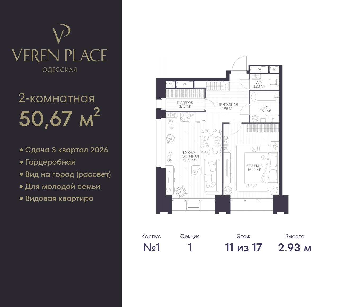 Просторная 1-комн. квартира в ЖК "VEREN PLACE Одесская" на 11 этаже. Квартира без отделки, новый собственник может сделать ремонт по своему дизайн-проекту. Общая площадь: 50.67 кв.м., жилая: 16.11 кв.м., площадь просторной куxни-гостиной: 18.77 кв.м. Угловая квартира, очень светлая, естественная вентиляция при открытии окон. В квартире один раздельный санузел. Высота потолков 2.93 м. Квартира находится в корпусе 1. Дом монолитный, одноподъездный, высотой 17 этажей. На этаже 8 квартир. В подъезде 1 пассажирский и 1 грузовой лифт. Окончание строительства - 3 квартал 2026 года. Оформление сделки по договору долевого участия. Вид на город (рассвет), гардеробная, 2 санузла. “VEREN PLACE ОДЕССКАЯ” - это 17-этажный клубный дом бизнес-класса, который разместится на высоком берегу Оки на исторической территории в Старом Нижнем Новгороде. Комплекс «VEREN PLACE ОДЕССКАЯ» продолжает линейку проектов бизнес-класса от VEREN GROUP. Жилой комплекс имеет удобное расположение — в локации с насыщенной социальной и торговой инфраструктурой. Рядом находятся детский сад № 135, корпус ННГУ, ТЦ «Небо», а в 20 минутах ходьбы — центральная прогулочная улица города Большая Покровская. Архитектурный проект нового жилого комплекса был разработан именитым бюро «Остоженка». Отделка фасадов выполнена из кирпича и кортеновой стали, что в сочетании с панорамным остеклением, придает ему выразительный облик. Первый этаж запроектирован на высоте 13 метров. Таким образом, просторная входная группа имеет высоту потолков 10 метров, что делает ее интерьер уникальным. Благодаря расположению и продуманной архитектуре из каждой квартиры как на верхних, так и на нижних уровнях будут открываться живописные виды. Просторные стильные холлы в высотке будут выполнены по индивидуальному проекту. В доме предусмотрено два лифта — пассажирский с панорамным остеклением и грузовой. Будущие жильцы смогут спуститься, в том числе на подземную парковку, рассчитанную на 94 машино-места, также предусмотрен гостевой паркинг. В «VEREN PLACE ОДЕССКАЯ» будут системы контроля доступа и видеонаблюдения. Предполагается собственная огороженная территория, благоустроенная по авторскому дизайн-проекту с учетом последних тенденций ландшафтной архитектуры. Здесь разместятся зоны отдыха, воркаут зона и детская площадка. В доме предусмотрено 114 квартир различного формата площадью от 50 до 156 кв. м (от четырех до восьми квартир на каждом этаже). Во всех квартирах панорамное остекление, а на верхних этажах запроектированы террасы с видом на закат и слияние Оки и Волги. Отделка квартир в проекте не предусмотрена. (AQID02411605)