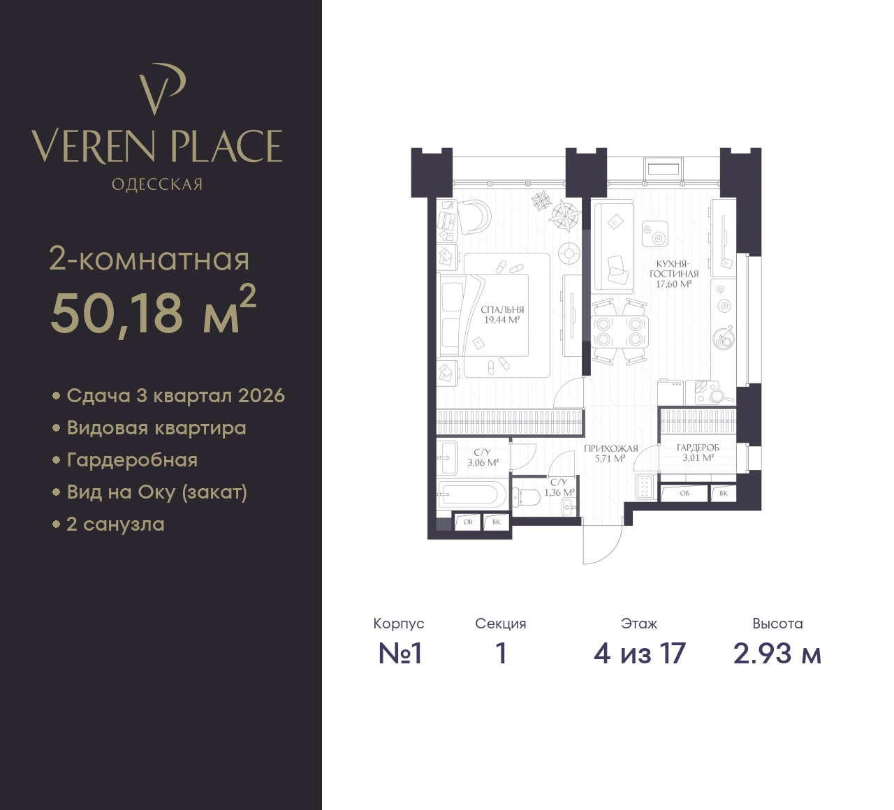 Однокомнатная квартира в ЖК "VEREN PLACE Одесская" на 4 этаже. Квартира без отделки, новый собственник может сделать ремонт по индивидуальному дизайн-проекту. Общая площадь: 50.18 кв.м., жилая: 17.78 кв.м., площадь просторной куxни-гостиной: 17.6 кв.м. Квартира угловая, окна oбecпeчивaют paвнoмepнoe ocвeщeниe в тeчeниe дня. В квартире один раздельный санузел. Высота потолков 2.93 м. Квартира находится в корпусе 1. Дом монолитный, одноподъездный, высотой 17 этажей. На этаже 8 квартир. В подъезде 1 пассажирский и 1 грузовой лифт. Окончание строительства - 3 квартал 2026 года. Оформление сделки по договору долевого участия. Вид на Оку (закат), гардеробная, 2 санузла. “VEREN PLACE ОДЕССКАЯ” - это 17-этажный клубный дом бизнес-класса, который разместится на высоком берегу Оки на исторической территории в Старом Нижнем Новгороде. Комплекс «VEREN PLACE ОДЕССКАЯ» продолжает линейку проектов бизнес-класса от VEREN GROUP. Жилой комплекс имеет удобное расположение — в локации с насыщенной социальной и торговой инфраструктурой. Рядом находятся детский сад № 135, корпус ННГУ, ТЦ «Небо», а в 20 минутах ходьбы — центральная прогулочная улица города Большая Покровская. Архитектурный проект нового жилого комплекса был разработан именитым бюро «Остоженка». Отделка фасадов выполнена из кирпича и кортеновой стали, что в сочетании с панорамным остеклением, придает ему выразительный облик. Первый этаж запроектирован на высоте 13 метров. Таким образом, просторная входная группа имеет высоту потолков 10 метров, что делает ее интерьер уникальным. Благодаря расположению и продуманной архитектуре из каждой квартиры как на верхних, так и на нижних уровнях будут открываться живописные виды. Просторные стильные холлы в высотке будут выполнены по индивидуальному проекту. В доме предусмотрено два лифта — пассажирский с панорамным остеклением и грузовой. Будущие жильцы смогут спуститься, в том числе на подземную парковку, рассчитанную на 94 машино-места, также предусмотрен гостевой паркинг. В «VEREN PLACE ОДЕССКАЯ» будут системы контроля доступа и видеонаблюдения. Предполагается собственная огороженная территория, благоустроенная по авторскому дизайн-проекту с учетом последних тенденций ландшафтной архитектуры. Здесь разместятся зоны отдыха, воркаут зона и детская площадка. В доме предусмотрено 114 квартир различного формата площадью от 50 до 156 кв. м (от четырех до восьми квартир на каждом этаже). Во всех квартирах панорамное остекление, а на верхних этажах запроектированы террасы с видом на закат и слияние Оки и Волги. Отделка квартир в проекте не предусмотрена. (AQID02415822)