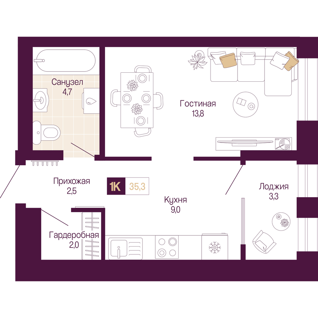 - Общая площадь 33.7 м²