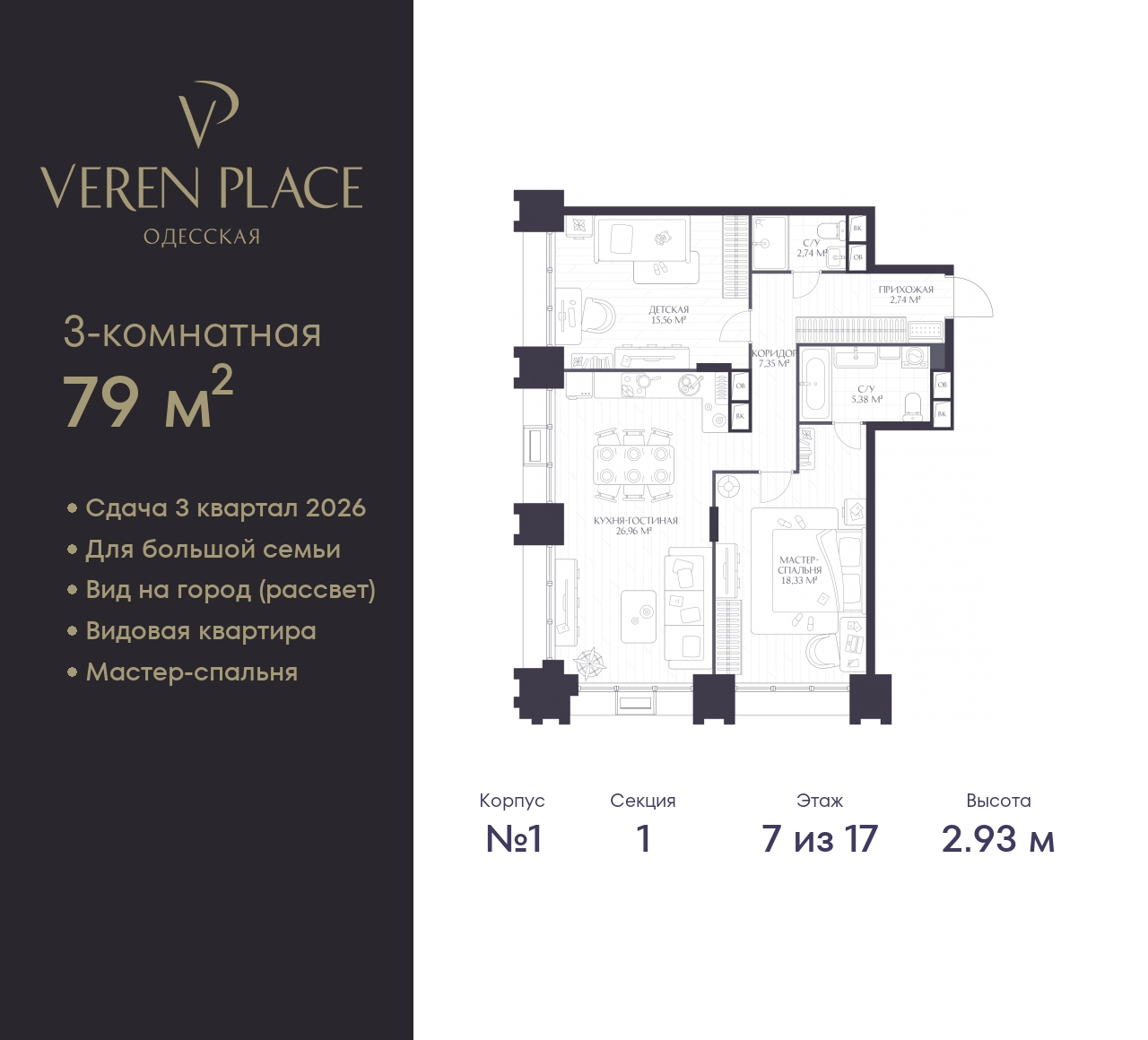 Просторная двухкомнатная квартира в ЖК "VEREN PLACE Одесская" на 7 этаже. Квартира без отделки, новый собственник может сделать ремонт по индивидуальному проекту. Общая площадь: 79 кв.м., жилая: 33.89 кв.м., площадь просторной куxни-гостиной: 26.9 кв.м. Угловая квартира, очень светлая, естественная вентиляция при открытии окон. В квартире два совмещенных санузла. Высота потолков 2.93 м. Квартира находится в корпусе 1. Дом монолитный, одноподъездный, высотой 17 этажей. На этаже 8 квартир. В подъезде 1 пассажирский и 1 грузовой лифт. Окончание строительства - 3 квартал 2026 года. Оформление сделки по договору долевого участия. Вид на город (рассвет), мастер-спальня, 2 санузла. “VEREN PLACE ОДЕССКАЯ” - это 17-этажный клубный дом бизнес-класса, который разместится на высоком берегу Оки на исторической территории в Старом Нижнем Новгороде. Комплекс «VEREN PLACE ОДЕССКАЯ» продолжает линейку проектов бизнес-класса от VEREN GROUP. Жилой комплекс имеет удобное расположение — в локации с насыщенной социальной и торговой инфраструктурой. Рядом находятся детский сад № 135, корпус ННГУ, ТЦ «Небо», а в 20 минутах ходьбы — центральная прогулочная улица города Большая Покровская. Архитектурный проект нового жилого комплекса был разработан именитым бюро «Остоженка». Отделка фасадов выполнена из кирпича и кортеновой стали, что в сочетании с панорамным остеклением, придает ему выразительный облик. Первый этаж запроектирован на высоте 13 метров. Таким образом, просторная входная группа имеет высоту потолков 10 метров, что делает ее интерьер уникальным. Благодаря расположению и продуманной архитектуре из каждой квартиры как на верхних, так и на нижних уровнях будут открываться живописные виды. Просторные стильные холлы в высотке будут выполнены по индивидуальному проекту. В доме предусмотрено два лифта — пассажирский с панорамным остеклением и грузовой. Будущие жильцы смогут спуститься, в том числе на подземную парковку, рассчитанную на 94 машино-места, также предусмотрен гостевой паркинг. В «VEREN PLACE ОДЕССКАЯ» будут системы контроля доступа и видеонаблюдения. Предполагается собственная огороженная территория, благоустроенная по авторскому дизайн-проекту с учетом последних тенденций ландшафтной архитектуры. Здесь разместятся зоны отдыха, воркаут зона и детская площадка. В доме предусмотрено 114 квартир различного формата площадью от 50 до 156 кв. м (от четырех до восьми квартир на каждом этаже). Во всех квартирах панорамное остекление, а на верхних этажах запроектированы террасы с видом на закат и слияние Оки и Волги. Отделка квартир в проекте не предусмотрена. (AQID02411646)