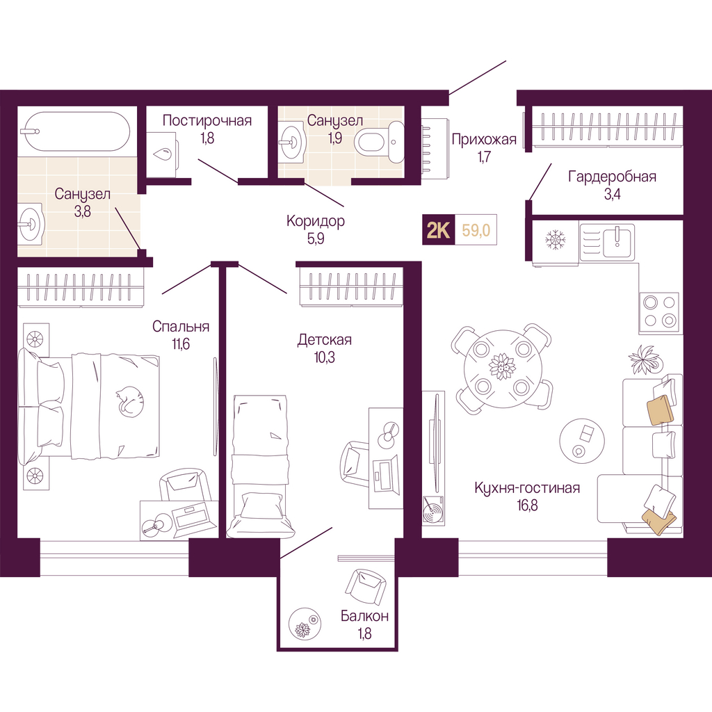 - Общая площадь 57.7 м²