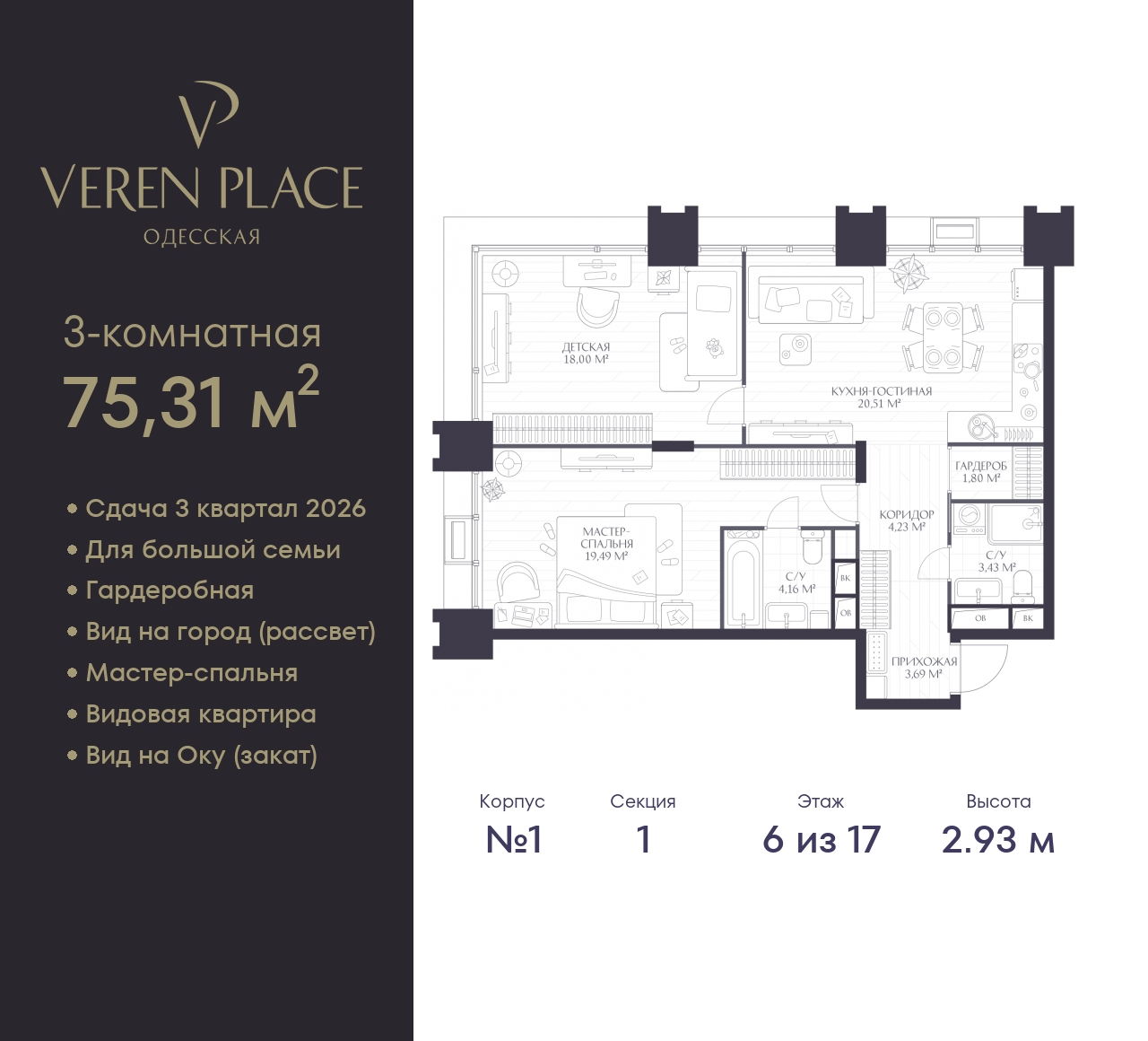 Продается 2-комн. квартира в ЖК "VEREN PLACE Одесская" на 6 этаже. Квартира без отделки, полностью готова к ремонту. Общая площадь: 75.31 кв.м., жилая: 37.49 кв.м., площадь просторной куxни-гостиной: 20.51 кв.м. Угловая квартира, идеально подойдет любителям тишины и панорамных видов. В квартире два совмещенных санузла. Высота потолков 2.93 м. Квартира находится в корпусе 1. Дом монолитный, одноподъездный, высотой 17 этажей. На этаже 8 квартир. В подъезде 1 пассажирский и 1 грузовой лифт. Окончание строительства - 3 квартал 2026 года. Оформление сделки по договору долевого участия. Вид на Оку (закат), мастер-спальня, гардеробная, 2 санузла. “VEREN PLACE ОДЕССКАЯ” - это 17-этажный клубный дом бизнес-класса, который разместится на высоком берегу Оки на исторической территории в Старом Нижнем Новгороде. Комплекс «VEREN PLACE ОДЕССКАЯ» продолжает линейку проектов бизнес-класса от VEREN GROUP. Жилой комплекс имеет удобное расположение — в локации с насыщенной социальной и торговой инфраструктурой. Рядом находятся детский сад № 135, корпус ННГУ, ТЦ «Небо», а в 20 минутах ходьбы — центральная прогулочная улица города Большая Покровская. Архитектурный проект нового жилого комплекса был разработан именитым бюро «Остоженка». Отделка фасадов выполнена из кирпича и кортеновой стали, что в сочетании с панорамным остеклением, придает ему выразительный облик. Первый этаж запроектирован на высоте 13 метров. Таким образом, просторная входная группа имеет высоту потолков 10 метров, что делает ее интерьер уникальным. Благодаря расположению и продуманной архитектуре из каждой квартиры как на верхних, так и на нижних уровнях будут открываться живописные виды. Просторные стильные холлы в высотке будут выполнены по индивидуальному проекту. В доме предусмотрено два лифта — пассажирский с панорамным остеклением и грузовой. Будущие жильцы смогут спуститься, в том числе на подземную парковку, рассчитанную на 94 машино-места, также предусмотрен гостевой паркинг. В «VEREN PLACE ОДЕССКАЯ» будут системы контроля доступа и видеонаблюдения. Предполагается собственная огороженная территория, благоустроенная по авторскому дизайн-проекту с учетом последних тенденций ландшафтной архитектуры. Здесь разместятся зоны отдыха, воркаут зона и детская площадка. В доме предусмотрено 114 квартир различного формата площадью от 50 до 156 кв. м (от четырех до восьми квартир на каждом этаже). Во всех квартирах панорамное остекление, а на верхних этажах запроектированы террасы с видом на закат и слияние Оки и Волги. Отделка квартир в проекте не предусмотрена. (AQID02411641)