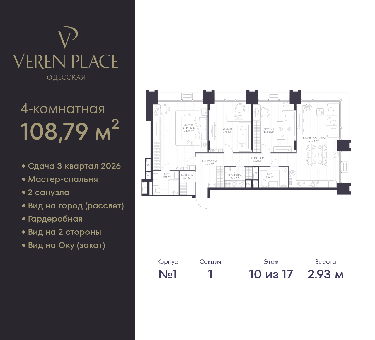 3-комн. квартира в ЖК "VEREN PLACE Одесская" на 10 этаже. Квартира без отделки, новый владелец может сделать ремонт по индивидуальному дизайн-проекту. Общая площадь: 108.79 кв.м., жилая: 53.6 кв.м., площадь просторной куxни-гостиной: 27.38 кв.м. Угловая квартира, очень светлая, естественная вентиляция при открытии окон. В квартире два совмещенных санузла. Высота потолков 2.93 м. Квартира находится в корпусе 1. Дом монолитный, одноподъездный, высотой 17 этажей. На этаже 8 квартир. В подъезде 1 пассажирский и 1 грузовой лифт. Окончание строительства - 3 квартал 2026 года. Оформление сделки по договору долевого участия. Вид на Оку (закат), вид на город (рассвет), мастер-спальня, прачечная, гардеробная, вид на 2 стороны, 2 санузла. “VEREN PLACE ОДЕССКАЯ” - это 17-этажный клубный дом бизнес-класса, который разместится на высоком берегу Оки на исторической территории в Старом Нижнем Новгороде. Комплекс «VEREN PLACE ОДЕССКАЯ» продолжает линейку проектов бизнес-класса от VEREN GROUP. Жилой комплекс имеет удобное расположение — в локации с насыщенной социальной и торговой инфраструктурой. Рядом находятся детский сад № 135, корпус ННГУ, ТЦ «Небо», а в 20 минутах ходьбы — центральная прогулочная улица города Большая Покровская. Архитектурный проект нового жилого комплекса был разработан именитым бюро «Остоженка». Отделка фасадов выполнена из кирпича и кортеновой стали, что в сочетании с панорамным остеклением, придает ему выразительный облик. Первый этаж запроектирован на высоте 13 метров. Таким образом, просторная входная группа имеет высоту потолков 10 метров, что делает ее интерьер уникальным. Благодаря расположению и продуманной архитектуре из каждой квартиры как на верхних, так и на нижних уровнях будут открываться живописные виды. Просторные стильные холлы в высотке будут выполнены по индивидуальному проекту. В доме предусмотрено два лифта — пассажирский с панорамным остеклением и грузовой. Будущие жильцы смогут спуститься, в том числе на подземную парковку, рассчитанную на 94 машино-места, также предусмотрен гостевой паркинг. В «VEREN PLACE ОДЕССКАЯ» будут системы контроля доступа и видеонаблюдения. Предполагается собственная огороженная территория, благоустроенная по авторскому дизайн-проекту с учетом последних тенденций ландшафтной архитектуры. Здесь разместятся зоны отдыха, воркаут зона и детская площадка. В доме предусмотрено 114 квартир различного формата площадью от 50 до 156 кв. м (от четырех до восьми квартир на каждом этаже). Во всех квартирах панорамное остекление, а на верхних этажах запроектированы террасы с видом на закат и слияние Оки и Волги. Отделка квартир в проекте не предусмотрена. (AQID02415792)
