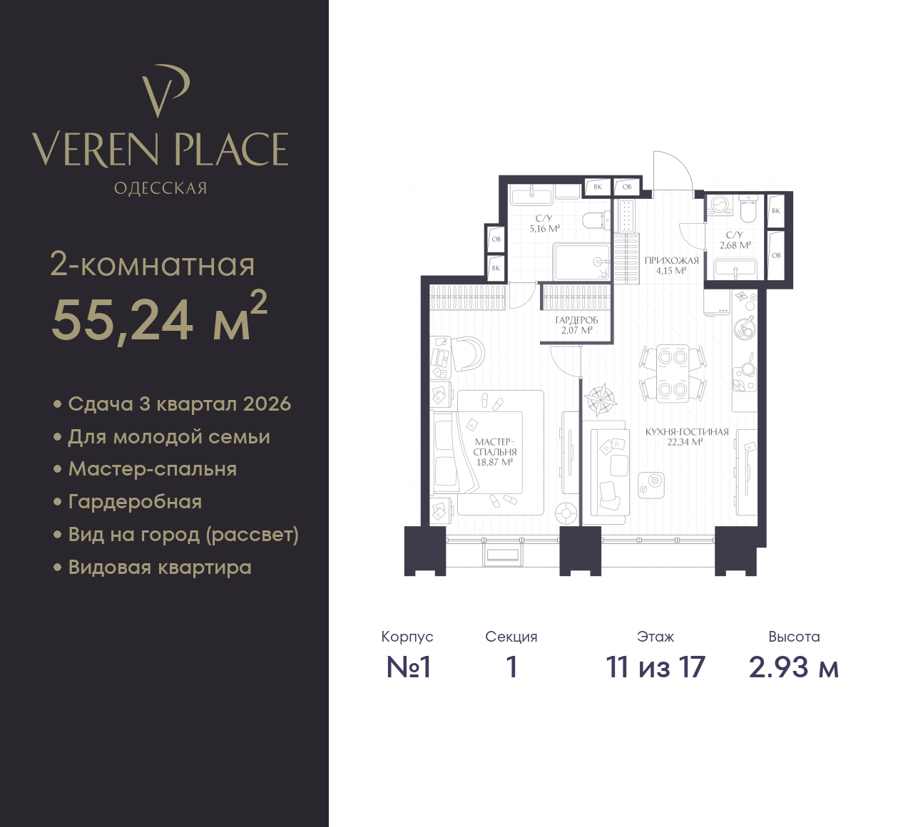 Просторная однокомнатная квартира в ЖК "VEREN PLACE Одесская" на 11 этаже. Квартира без отделки, после оформления собственности можно делать ремонт. Общая площадь: 55.24 кв.м., жилая: 18.87 кв.м., площадь просторной куxни-гостиной: 22.34 кв.м. Все окна выходят на одну сторону. В квартире один совмещенный и один раздельный санузел. Высота потолков 2.93 м. Квартира находится в корпусе 1. Дом монолитный, одноподъездный, высотой 17 этажей. На этаже 8 квартир. В подъезде 1 пассажирский и 1 грузовой лифт. Окончание строительства - 3 квартал 2026 года. Оформление сделки по договору долевого участия. Вид на город (рассвет), мастер-спальня, гардеробная, 2 санузла. “VEREN PLACE ОДЕССКАЯ” - это 17-этажный клубный дом бизнес-класса, который разместится на высоком берегу Оки на исторической территории в Старом Нижнем Новгороде. Комплекс «VEREN PLACE ОДЕССКАЯ» продолжает линейку проектов бизнес-класса от VEREN GROUP. Жилой комплекс имеет удобное расположение — в локации с насыщенной социальной и торговой инфраструктурой. Рядом находятся детский сад № 135, корпус ННГУ, ТЦ «Небо», а в 20 минутах ходьбы — центральная прогулочная улица города Большая Покровская. Архитектурный проект нового жилого комплекса был разработан именитым бюро «Остоженка». Отделка фасадов выполнена из кирпича и кортеновой стали, что в сочетании с панорамным остеклением, придает ему выразительный облик. Первый этаж запроектирован на высоте 13 метров. Таким образом, просторная входная группа имеет высоту потолков 10 метров, что делает ее интерьер уникальным. Благодаря расположению и продуманной архитектуре из каждой квартиры как на верхних, так и на нижних уровнях будут открываться живописные виды. Просторные стильные холлы в высотке будут выполнены по индивидуальному проекту. В доме предусмотрено два лифта — пассажирский с панорамным остеклением и грузовой. Будущие жильцы смогут спуститься, в том числе на подземную парковку, рассчитанную на 94 машино-места, также предусмотрен гостевой паркинг. В «VEREN PLACE ОДЕССКАЯ» будут системы контроля доступа и видеонаблюдения. Предполагается собственная огороженная территория, благоустроенная по авторскому дизайн-проекту с учетом последних тенденций ландшафтной архитектуры. Здесь разместятся зоны отдыха, воркаут зона и детская площадка. В доме предусмотрено 114 квартир различного формата площадью от 50 до 156 кв. м (от четырех до восьми квартир на каждом этаже). Во всех квартирах панорамное остекление, а на верхних этажах запроектированы террасы с видом на закат и слияние Оки и Волги. Отделка квартир в проекте не предусмотрена. (AQID02411600)