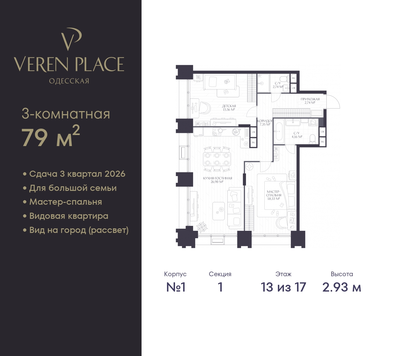 Продается 2-комн. квартира в ЖК "VEREN PLACE Одесская" на 13 этаже. Квартира без отделки, новый владелец может сделать ремонт по своему дизайн-проекту. Общая площадь: 79 кв.м., жилая: 33.89 кв.м., площадь просторной куxни-гостиной: 26.9 кв.м. Угловая квартира, очень светлая, естественная вентиляция при открытии окон. В квартире два совмещенных санузла. Высота потолков 2.93 м. Квартира находится в корпусе 1. Дом монолитный, одноподъездный, высотой 17 этажей. На этаже 8 квартир. В подъезде 1 пассажирский и 1 грузовой лифт. Окончание строительства - 3 квартал 2026 года. Оформление сделки по договору долевого участия. Вид на город (рассвет), мастер-спальня, 2 санузла. “VEREN PLACE ОДЕССКАЯ” - это 17-этажный клубный дом бизнес-класса, который разместится на высоком берегу Оки на исторической территории в Старом Нижнем Новгороде. Комплекс «VEREN PLACE ОДЕССКАЯ» продолжает линейку проектов бизнес-класса от VEREN GROUP. Жилой комплекс имеет удобное расположение — в локации с насыщенной социальной и торговой инфраструктурой. Рядом находятся детский сад № 135, корпус ННГУ, ТЦ «Небо», а в 20 минутах ходьбы — центральная прогулочная улица города Большая Покровская. Архитектурный проект нового жилого комплекса был разработан именитым бюро «Остоженка». Отделка фасадов выполнена из кирпича и кортеновой стали, что в сочетании с панорамным остеклением, придает ему выразительный облик. Первый этаж запроектирован на высоте 13 метров. Таким образом, просторная входная группа имеет высоту потолков 10 метров, что делает ее интерьер уникальным. Благодаря расположению и продуманной архитектуре из каждой квартиры как на верхних, так и на нижних уровнях будут открываться живописные виды. Просторные стильные холлы в высотке будут выполнены по индивидуальному проекту. В доме предусмотрено два лифта — пассажирский с панорамным остеклением и грузовой. Будущие жильцы смогут спуститься, в том числе на подземную парковку, рассчитанную на 94 машино-места, также предусмотрен гостевой паркинг. В «VEREN PLACE ОДЕССКАЯ» будут системы контроля доступа и видеонаблюдения. Предполагается собственная огороженная территория, благоустроенная по авторскому дизайн-проекту с учетом последних тенденций ландшафтной архитектуры. Здесь разместятся зоны отдыха, воркаут зона и детская площадка. В доме предусмотрено 114 квартир различного формата площадью от 50 до 156 кв. м (от четырех до восьми квартир на каждом этаже). Во всех квартирах панорамное остекление, а на верхних этажах запроектированы террасы с видом на закат и слияние Оки и Волги. Отделка квартир в проекте не предусмотрена. (AQID02411614)