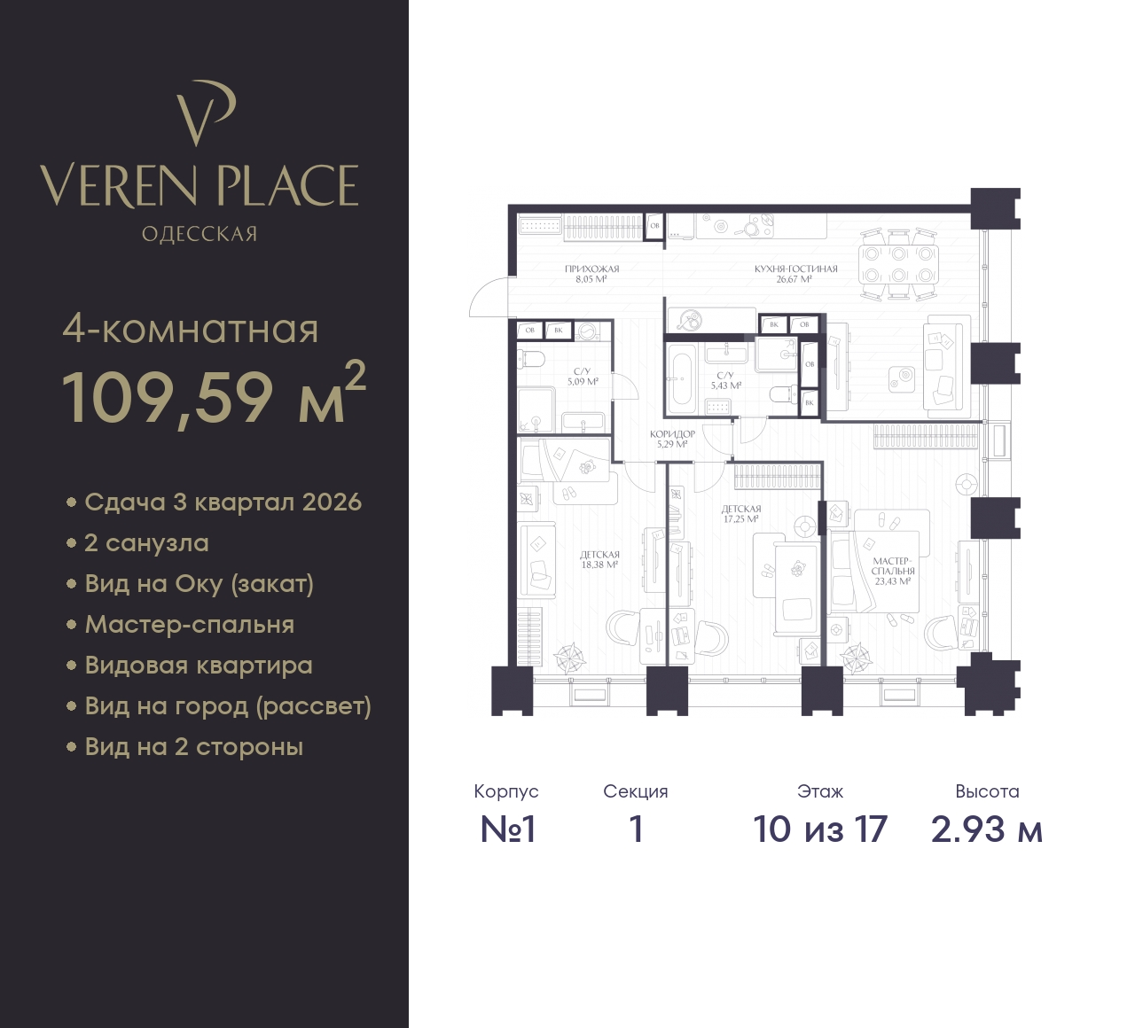 Продается 3-комн. квартира в ЖК "VEREN PLACE Одесская" на 10 этаже. Квартира без отделки, новый владелец может сделать ремонт по индивидуальному проекту. Общая площадь: 109.59 кв.м., жилая: 59.06 кв.м., площадь просторной куxни-гостиной: 26.67 кв.м. Угловая квартира, очень светлая, естественная вентиляция при открытии окон. В квартире два совмещенных санузла. Высота потолков 2.93 м. Квартира находится в корпусе 1. Дом монолитный, одноподъездный, высотой 17 этажей. На этаже 8 квартир. В подъезде 1 пассажирский и 1 грузовой лифт. Окончание строительства - 3 квартал 2026 года. Оформление сделки по договору долевого участия. Вид на город (рассвет), 2 санузла. “VEREN PLACE ОДЕССКАЯ” - это 17-этажный клубный дом бизнес-класса, который разместится на высоком берегу Оки на исторической территории в Старом Нижнем Новгороде. Комплекс «VEREN PLACE ОДЕССКАЯ» продолжает линейку проектов бизнес-класса от VEREN GROUP. Жилой комплекс имеет удобное расположение — в локации с насыщенной социальной и торговой инфраструктурой. Рядом находятся детский сад № 135, корпус ННГУ, ТЦ «Небо», а в 20 минутах ходьбы — центральная прогулочная улица города Большая Покровская. Архитектурный проект нового жилого комплекса был разработан именитым бюро «Остоженка». Отделка фасадов выполнена из кирпича и кортеновой стали, что в сочетании с панорамным остеклением, придает ему выразительный облик. Первый этаж запроектирован на высоте 13 метров. Таким образом, просторная входная группа имеет высоту потолков 10 метров, что делает ее интерьер уникальным. Благодаря расположению и продуманной архитектуре из каждой квартиры как на верхних, так и на нижних уровнях будут открываться живописные виды. Просторные стильные холлы в высотке будут выполнены по индивидуальному проекту. В доме предусмотрено два лифта — пассажирский с панорамным остеклением и грузовой. Будущие жильцы смогут спуститься, в том числе на подземную парковку, рассчитанную на 94 машино-места, также предусмотрен гостевой паркинг. В «VEREN PLACE ОДЕССКАЯ» будут системы контроля доступа и видеонаблюдения. Предполагается собственная огороженная территория, благоустроенная по авторскому дизайн-проекту с учетом последних тенденций ландшафтной архитектуры. Здесь разместятся зоны отдыха, воркаут зона и детская площадка. В доме предусмотрено 114 квартир различного формата площадью от 50 до 156 кв. м (от четырех до восьми квартир на каждом этаже). Во всех квартирах панорамное остекление, а на верхних этажах запроектированы террасы с видом на закат и слияние Оки и Волги. Отделка квартир в проекте не предусмотрена. (AQID02415793)
