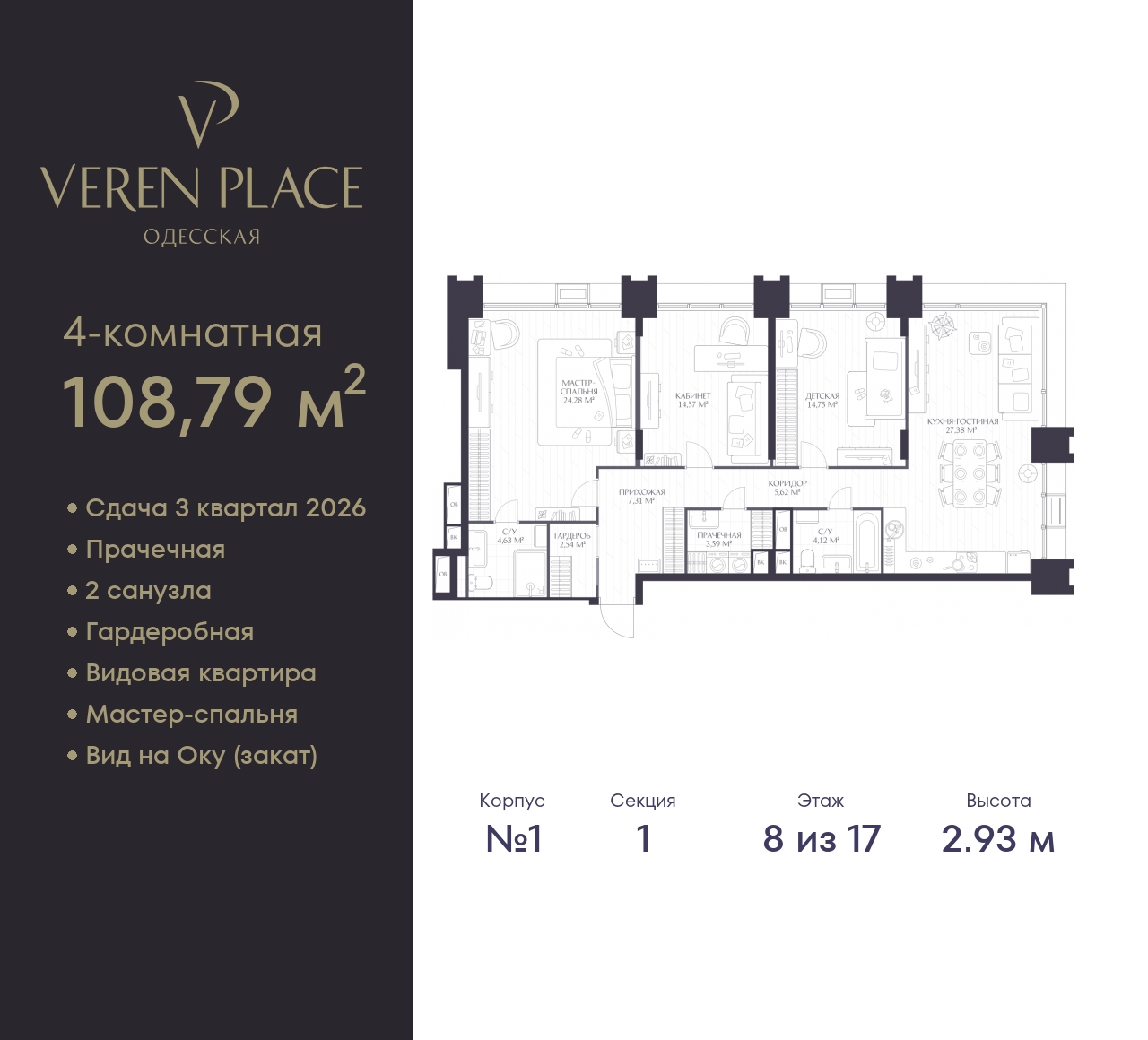 Просторная трехкомнатная квартира в ЖК "VEREN PLACE Одесская" на 8 этаже. Квартира без отделки, после выдачи ключей можно делать ремонт. Общая площадь: 108.79 кв.м., жилая: 53.6 кв.м., площадь просторной куxни-гостиной: 27.38 кв.м. Квартира угловая, идеально подойдет любителям тишины и панорамных видов. В квартире два совмещенных санузла. Высота потолков 2.93 м. Квартира находится в корпусе 1. Дом монолитный, одноподъездный, высотой 17 этажей. На этаже 8 квартир. В подъезде 1 пассажирский и 1 грузовой лифт. Окончание строительства - 3 квартал 2026 года. Оформление сделки по договору долевого участия. Вид на Оку (закат), вид на город (рассвет), мастер-спальня, прачечная, гардеробная, вид на 2 стороны, 2 санузла. “VEREN PLACE ОДЕССКАЯ” - это 17-этажный клубный дом бизнес-класса, который разместится на высоком берегу Оки на исторической территории в Старом Нижнем Новгороде. Комплекс «VEREN PLACE ОДЕССКАЯ» продолжает линейку проектов бизнес-класса от VEREN GROUP. Жилой комплекс имеет удобное расположение — в локации с насыщенной социальной и торговой инфраструктурой. Рядом находятся детский сад № 135, корпус ННГУ, ТЦ «Небо», а в 20 минутах ходьбы — центральная прогулочная улица города Большая Покровская. Архитектурный проект нового жилого комплекса был разработан именитым бюро «Остоженка». Отделка фасадов выполнена из кирпича и кортеновой стали, что в сочетании с панорамным остеклением, придает ему выразительный облик. Первый этаж запроектирован на высоте 13 метров. Таким образом, просторная входная группа имеет высоту потолков 10 метров, что делает ее интерьер уникальным. Благодаря расположению и продуманной архитектуре из каждой квартиры как на верхних, так и на нижних уровнях будут открываться живописные виды. Просторные стильные холлы в высотке будут выполнены по индивидуальному проекту. В доме предусмотрено два лифта — пассажирский с панорамным остеклением и грузовой. Будущие жильцы смогут спуститься, в том числе на подземную парковку, рассчитанную на 94 машино-места, также предусмотрен гостевой паркинг. В «VEREN PLACE ОДЕССКАЯ» будут системы контроля доступа и видеонаблюдения. Предполагается собственная огороженная территория, благоустроенная по авторскому дизайн-проекту с учетом последних тенденций ландшафтной архитектуры. Здесь разместятся зоны отдыха, воркаут зона и детская площадка. В доме предусмотрено 114 квартир различного формата площадью от 50 до 156 кв. м (от четырех до восьми квартир на каждом этаже). Во всех квартирах панорамное остекление, а на верхних этажах запроектированы террасы с видом на закат и слияние Оки и Волги. Отделка квартир в проекте не предусмотрена. (AQID02415829)
