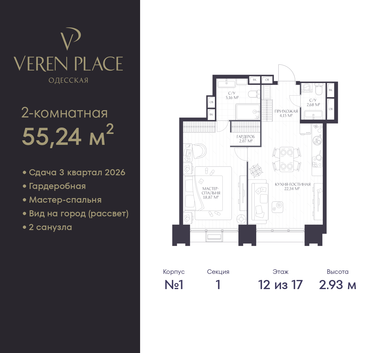 Однокомнатная квартира в ЖК "VEREN PLACE Одесская" на 12 этаже. Квартира без отделки, после получения ключей можно делать ремонт. Общая площадь: 55.24 кв.м., жилая: 18.87 кв.м., площадь просторной куxни-гостиной: 22.34 кв.м. Все окна выходят на одну сторону. В квартире один совмещенный и один раздельный санузел. Высота потолков 2.93 м. Квартира находится в корпусе 1. Дом монолитный, одноподъездный, высотой 17 этажей. На этаже 8 квартир. В подъезде 1 пассажирский и 1 грузовой лифт. Окончание строительства - 3 квартал 2026 года. Оформление сделки по договору долевого участия. Вид на город (рассвет), мастер-спальня, гардеробная, 2 санузла. “VEREN PLACE ОДЕССКАЯ” - это 17-этажный клубный дом бизнес-класса, который разместится на высоком берегу Оки на исторической территории в Старом Нижнем Новгороде. Комплекс «VEREN PLACE ОДЕССКАЯ» продолжает линейку проектов бизнес-класса от VEREN GROUP. Жилой комплекс имеет удобное расположение — в локации с насыщенной социальной и торговой инфраструктурой. Рядом находятся детский сад № 135, корпус ННГУ, ТЦ «Небо», а в 20 минутах ходьбы — центральная прогулочная улица города Большая Покровская. Архитектурный проект нового жилого комплекса был разработан именитым бюро «Остоженка». Отделка фасадов выполнена из кирпича и кортеновой стали, что в сочетании с панорамным остеклением, придает ему выразительный облик. Первый этаж запроектирован на высоте 13 метров. Таким образом, просторная входная группа имеет высоту потолков 10 метров, что делает ее интерьер уникальным. Благодаря расположению и продуманной архитектуре из каждой квартиры как на верхних, так и на нижних уровнях будут открываться живописные виды. Просторные стильные холлы в высотке будут выполнены по индивидуальному проекту. В доме предусмотрено два лифта — пассажирский с панорамным остеклением и грузовой. Будущие жильцы смогут спуститься, в том числе на подземную парковку, рассчитанную на 94 машино-места, также предусмотрен гостевой паркинг. В «VEREN PLACE ОДЕССКАЯ» будут системы контроля доступа и видеонаблюдения. Предполагается собственная огороженная территория, благоустроенная по авторскому дизайн-проекту с учетом последних тенденций ландшафтной архитектуры. Здесь разместятся зоны отдыха, воркаут зона и детская площадка. В доме предусмотрено 114 квартир различного формата площадью от 50 до 156 кв. м (от четырех до восьми квартир на каждом этаже). Во всех квартирах панорамное остекление, а на верхних этажах запроектированы террасы с видом на закат и слияние Оки и Волги. Отделка квартир в проекте не предусмотрена. (AQID02411606)