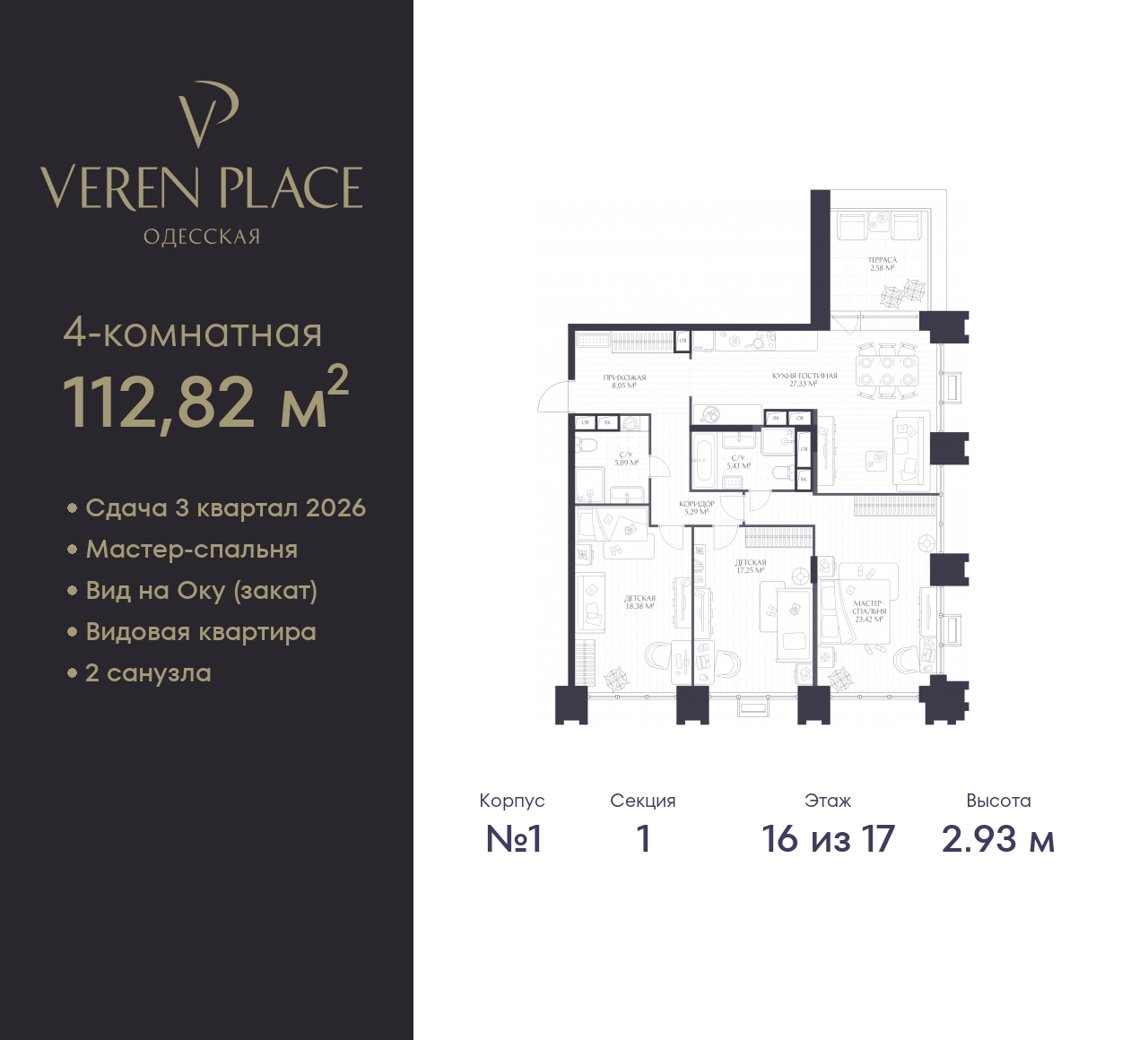 Просторная двухкомнатная квартира в ЖК "VEREN PLACE Одесская" на 16 этаже. Квартира без отделки, полностью готова к ремонту. Общая площадь: 112.82 кв.м., жилая: 40.67 кв.м., площадь просторной куxни-гостиной: 27.33 кв.м. Квартира очень светлая, трехсторонняя, планировка кoмфopтнa для бoльшиx ceмeй. В квартире один балкон, два совмещенных санузла. Терраса представляет собой роскошную зону отдыха для проведение вечеров в кругу семьи и друзей или организация вечеринок. Высота потолков 2.93 м. Квартира находится в корпусе 1. Дом монолитный, одноподъездный, высотой 17 этажей. На этаже 8 квартир. В подъезде 1 пассажирский и 1 грузовой лифт. Окончание строительства - 3 квартал 2026 года. Оформление сделки по договору долевого участия. Вид на Оку (закат), вид на город (рассвет), мастер-спальня, прачечная, гардеробная, вид на 2 стороны. “VEREN PLACE ОДЕССКАЯ” - это 17-этажный клубный дом бизнес-класса, который разместится на высоком берегу Оки на исторической территории в Старом Нижнем Новгороде. Комплекс «VEREN PLACE ОДЕССКАЯ» продолжает линейку проектов бизнес-класса от VEREN GROUP. Жилой комплекс имеет удобное расположение — в локации с насыщенной социальной и торговой инфраструктурой. Рядом находятся детский сад № 135, корпус ННГУ, ТЦ «Небо», а в 20 минутах ходьбы — центральная прогулочная улица города Большая Покровская. Архитектурный проект нового жилого комплекса был разработан именитым бюро «Остоженка». Отделка фасадов выполнена из кирпича и кортеновой стали, что в сочетании с панорамным остеклением, придает ему выразительный облик. Первый этаж запроектирован на высоте 13 метров. Таким образом, просторная входная группа имеет высоту потолков 10 метров, что делает ее интерьер уникальным. Благодаря расположению и продуманной архитектуре из каждой квартиры как на верхних, так и на нижних уровнях будут открываться живописные виды. Просторные стильные холлы в высотке будут выполнены по индивидуальному проекту. В доме предусмотрено два лифта — пассажирский с панорамным остеклением и грузовой. Будущие жильцы смогут спуститься, в том числе на подземную парковку, рассчитанную на 94 машино-места, также предусмотрен гостевой паркинг. В «VEREN PLACE ОДЕССКАЯ» будут системы контроля доступа и видеонаблюдения. Предполагается собственная огороженная территория, благоустроенная по авторскому дизайн-проекту с учетом последних тенденций ландшафтной архитектуры. Здесь разместятся зоны отдыха, воркаут зона и детская площадка. В доме предусмотрено 114 квартир различного формата площадью от 50 до 156 кв. м (от четырех до восьми квартир на каждом этаже). Во всех квартирах панорамное остекление, а на верхних этажах запроектированы террасы с видом на закат и слияние Оки и Волги. Отделка квартир в проекте не предусмотрена. (AQID02532305)