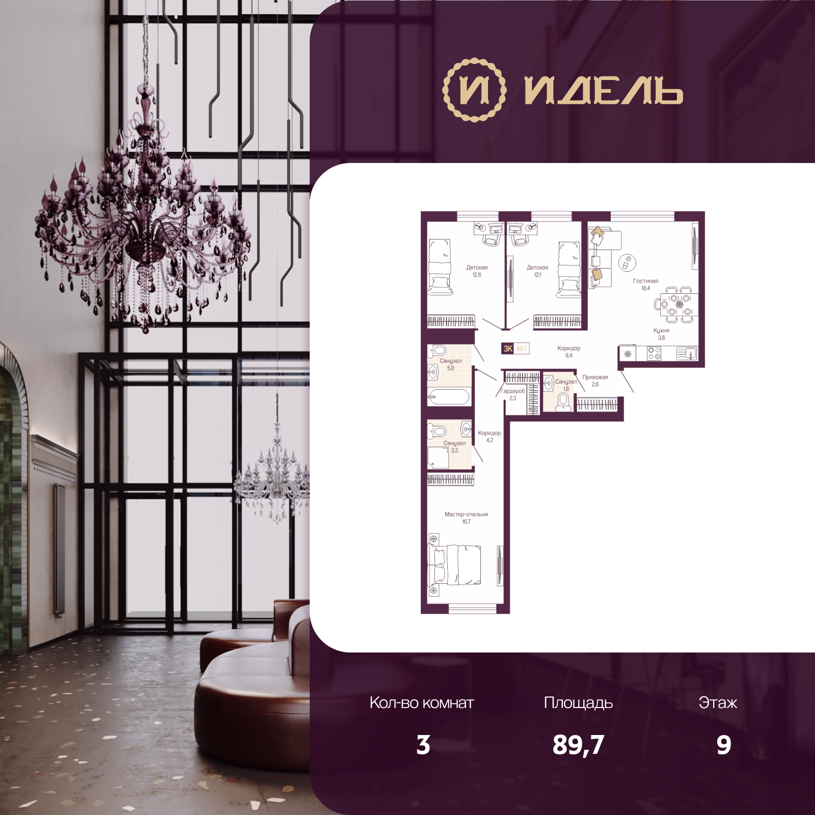 - Общая площадь 89.7 м²